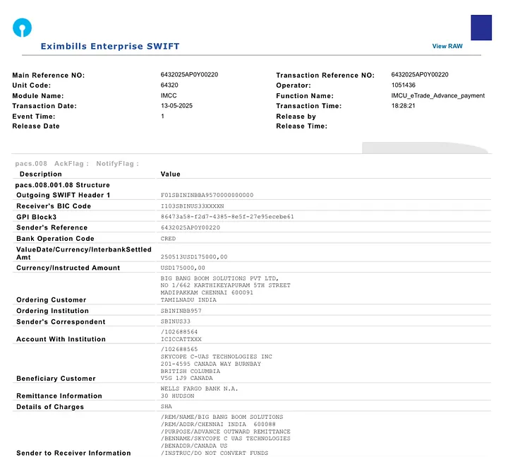 SWIFT payment dated 13th of May 2025 shows BBBS wiring $175,000 to SkyCope C-UAS Technologies in Canada. The payment purpose? Full-system procurement of an anti-drone defense platform. A screenshot of the said SWIFT payment is presented below.