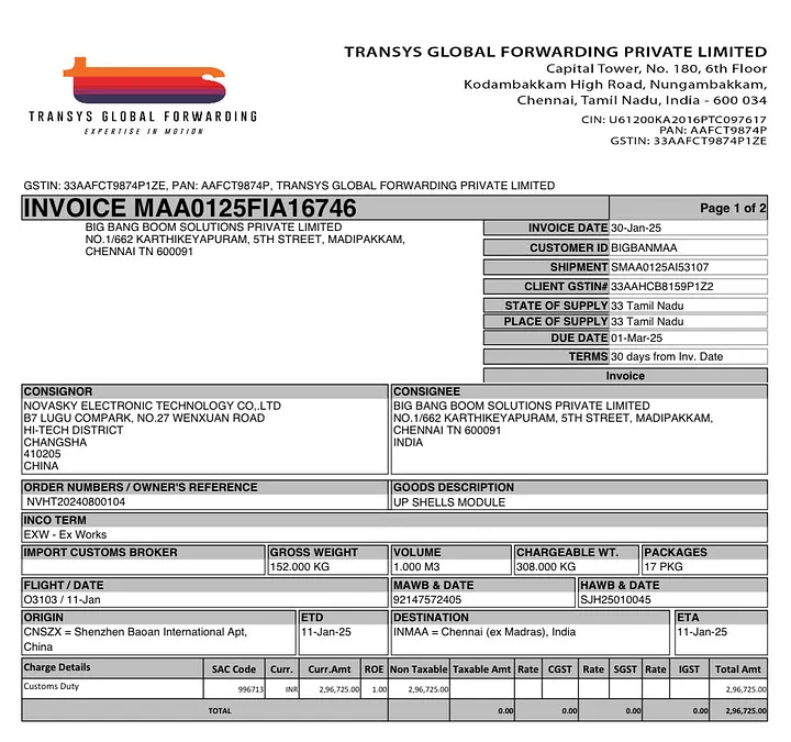 Supporting the evidence trail are customs documents and import invoices showing that BBBS imported a large batch of handheld jammers from Novasky (China), weighing over 150 kg, to their facility in Chennai. Evidence is presented below in the form of a screenshot of the invoice paid to the shipping company, Transys Global, who routinely transport goods between Chinese companies and Big Bang Boom Solutions Pvt Ltd.